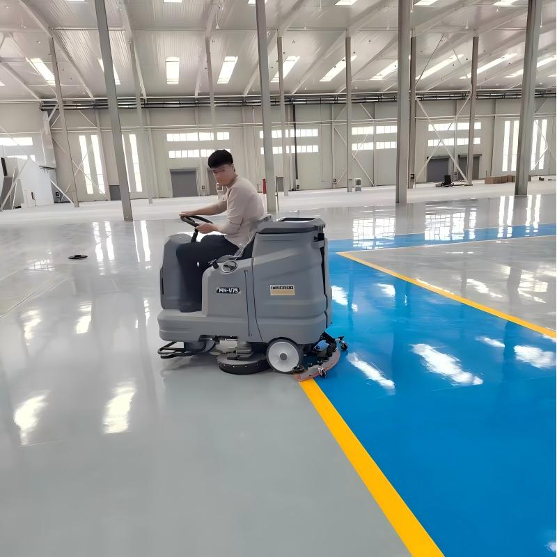 唐山海宏的场地涵盖生产车间、仓储大厅、产品展示区等,地面类型多样,包括环氧地坪、瓷砖,还存在部分易沾染油污的区域。而 MN-V75 恰好能满足其清洁需求:设备配备的 120L 清水箱与 130L 污水箱,减少了加水、排水频率,可实现大面积连续清洁。